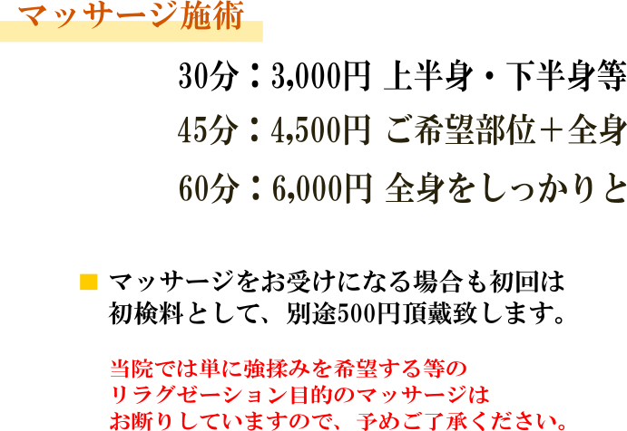 ※過労状態が根強く時間の延長が必要と判断した場合や、延長をご希望される場合は¥1,000~¥3,00の追加となります。最大延長は30分です。