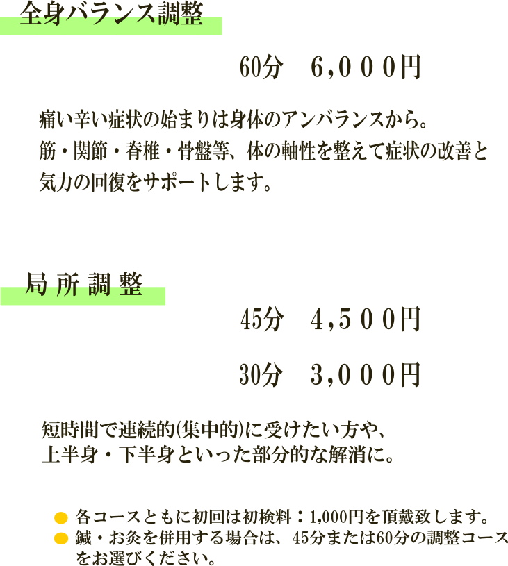【付価加算料金として】 上記のベーシックな調整に加えて身体状況に応じた処置や手技を行った場合別途、加算料金を頂戴致します。詳しくはお問い合わせください。 (料金目安)¥500~¥3,000